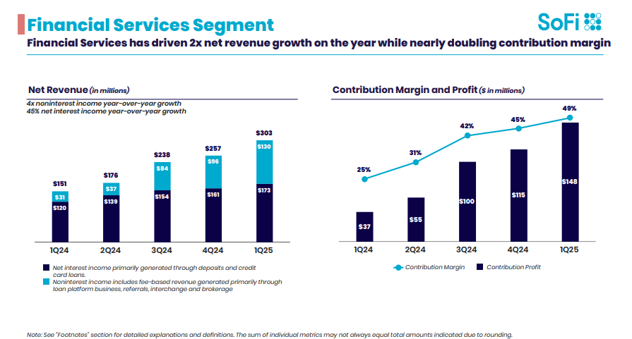 1Q25 金融服務部門淨營收 達到 3.03 億美元,其中非利息收入達到了驚人的 四倍年增長,整體毛利也從 1Q24 的 29% 上升至 1Q25 的 49% 成為了 SoFi 最主要的成長動能。