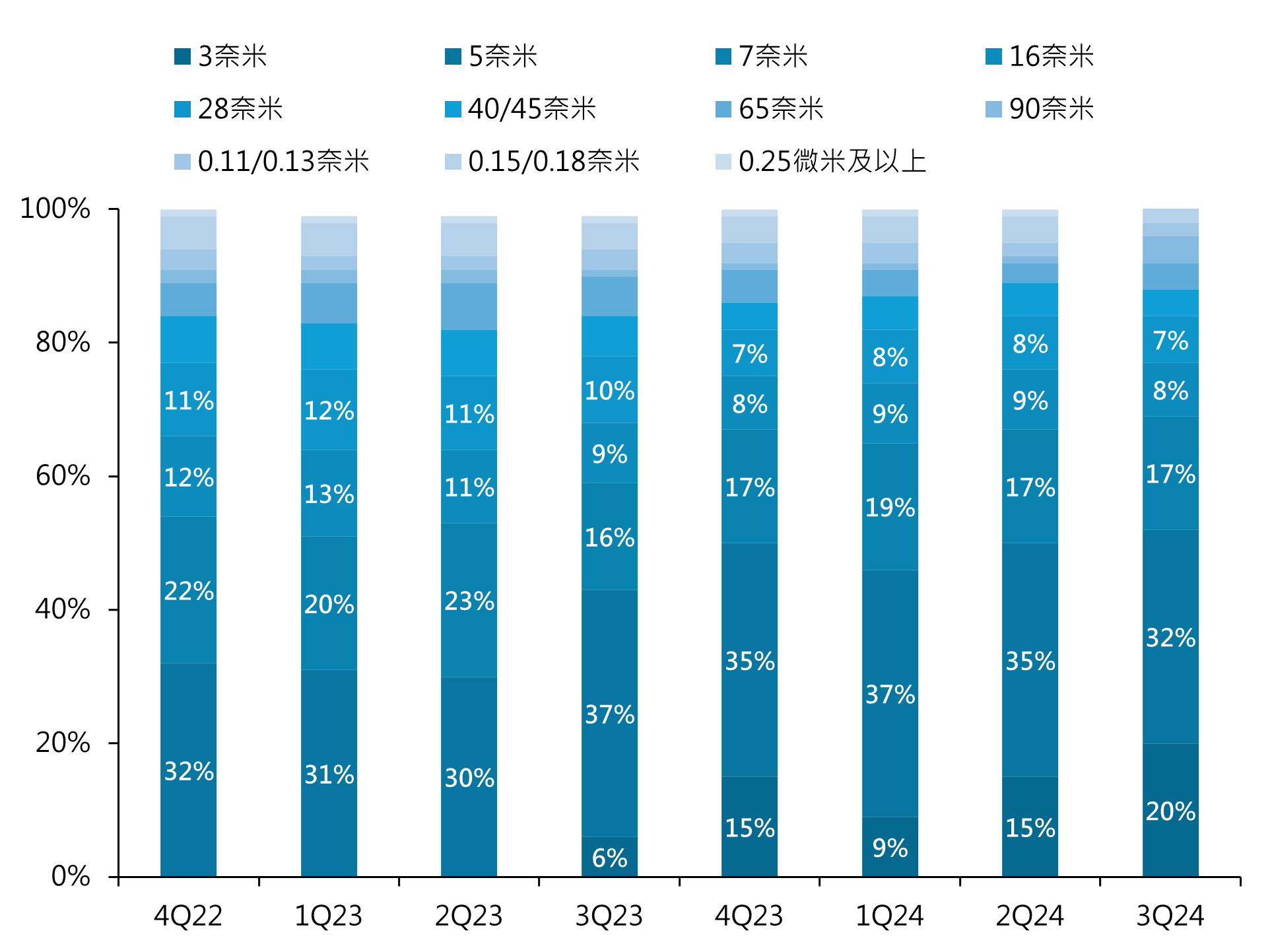 從製程別來看,可以看見 AI 晶片和智慧型手機對最新的 3 奈米需求強勁,3 奈米的占比首度上升至 20%。