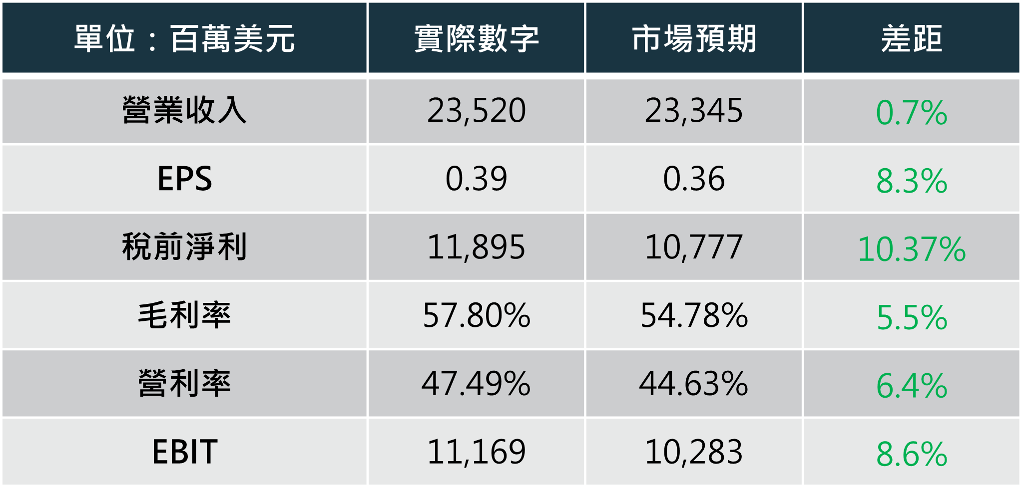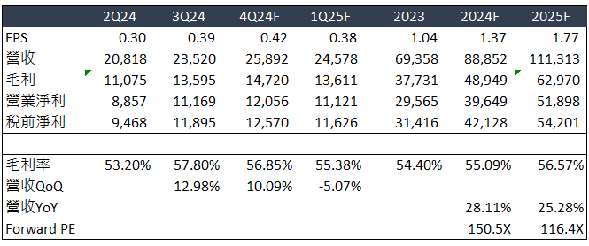 台積電於 10/18 公布 FY3Q24 財報,營收 YoY+36%,QoQ+13% 達 235 億美元,且高於市場預期的 233 億美元;EPS 為 0.39 美元,優於市場預期的 0.36 美元;營利率達 47.49%,高於市場預期的 44.63% 且相較於前季 (42.7%) 顯著上升;毛利率達 57.8%,優於預期的 54.78%,亦明顯高於前季的 53.2%。