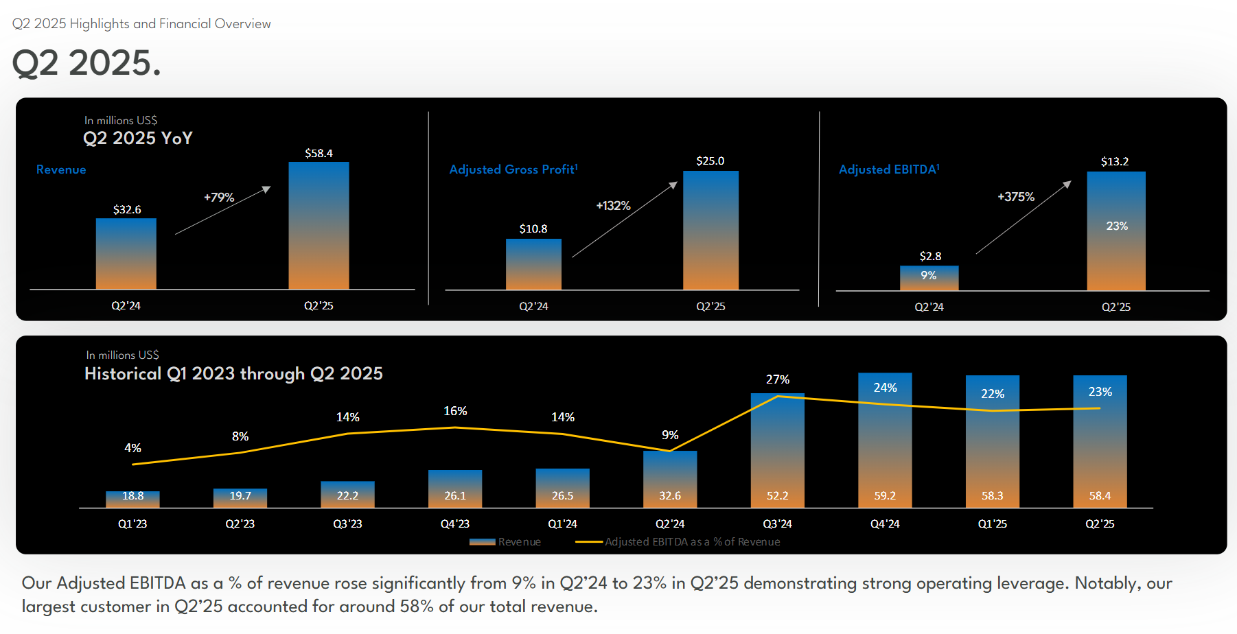 - 營收爆發:Q1 營收 US$58.3M(+120% YoY);Q2 營收 US$58.4M(+79% YoY)。