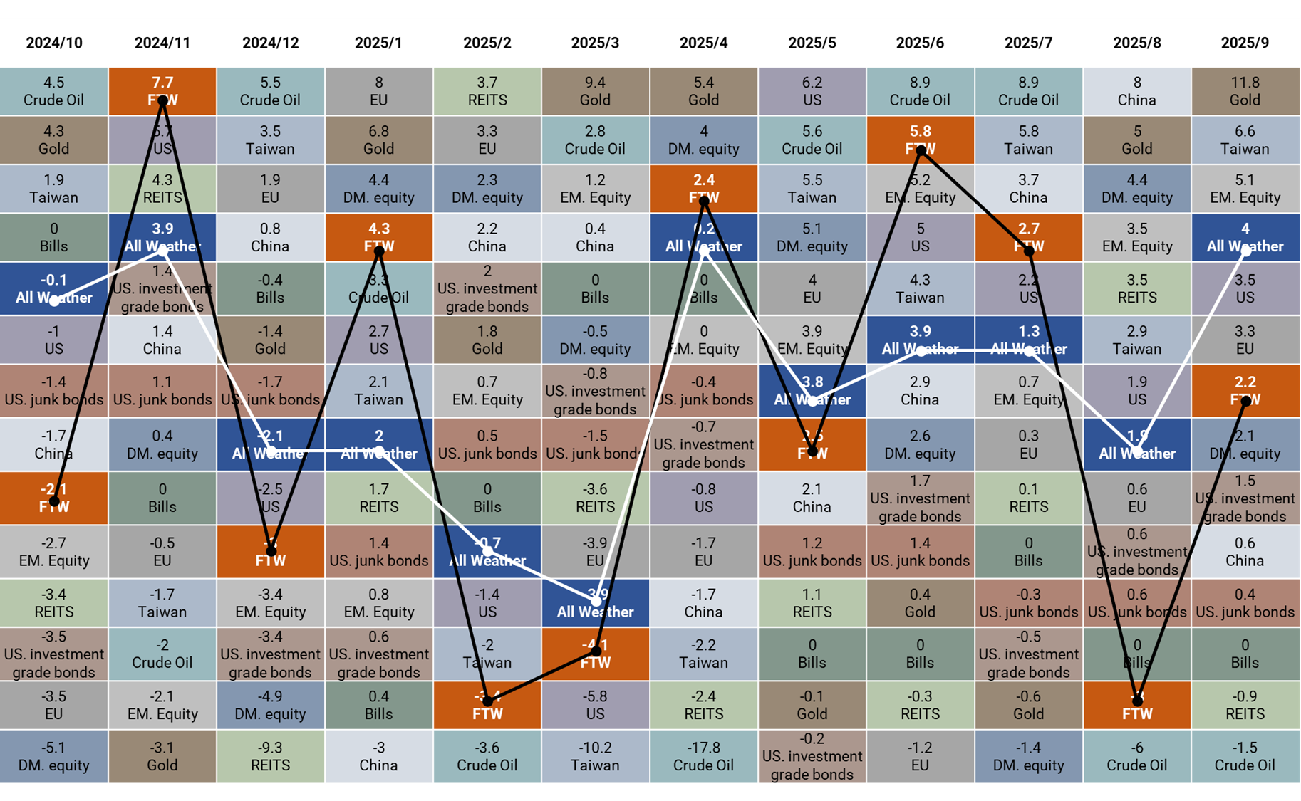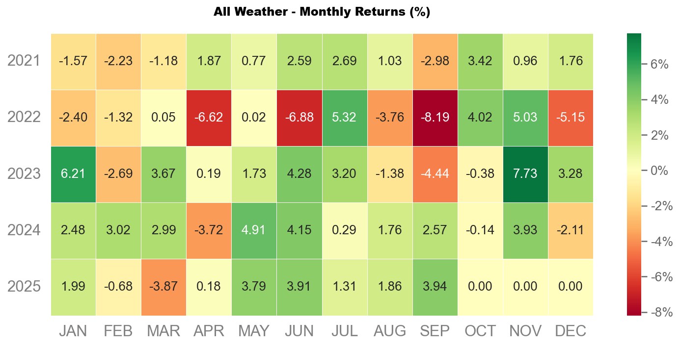 9 月沃勝全天候投資組合報酬 +4%。當月以黃金 (GLD) 表現最佳,該資產上漲 12%。