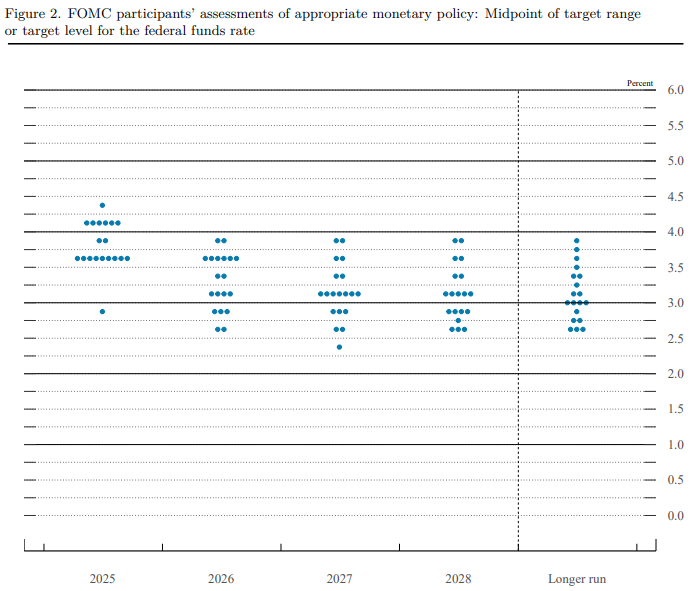 更關鍵的是同步公布的 SEP 點陣圖:2025 年底聯邦基金利率中位數自 6 月的 3.9% 下修至 3.6%。表面上,這意味著年底前仍「可能」再有 1–2 次降息;但若細看分佈,委員間的觀點出現更大的變異擴散,一端擔心服務通膨黏性,主張慢行;另一端直面就業降溫,支持更快寬鬆。這不是一條筆直的降息大道,而像是一條轉彎頻繁的山路:每一個彎,取決於下一次勞動市場與通膨數據。