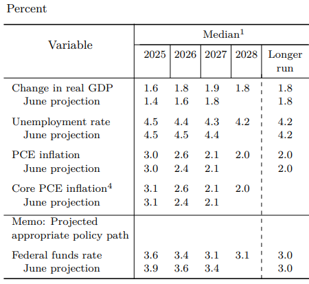 - 政策與利率路徑:9/17 FOMC 啟動降息 1 碼至 4.00%–4.25%,點陣圖顯示 2025 年底中位數由 3.9% 下修至 3.6%,釋出「循序、數據依賴」訊號而非線性降息。
