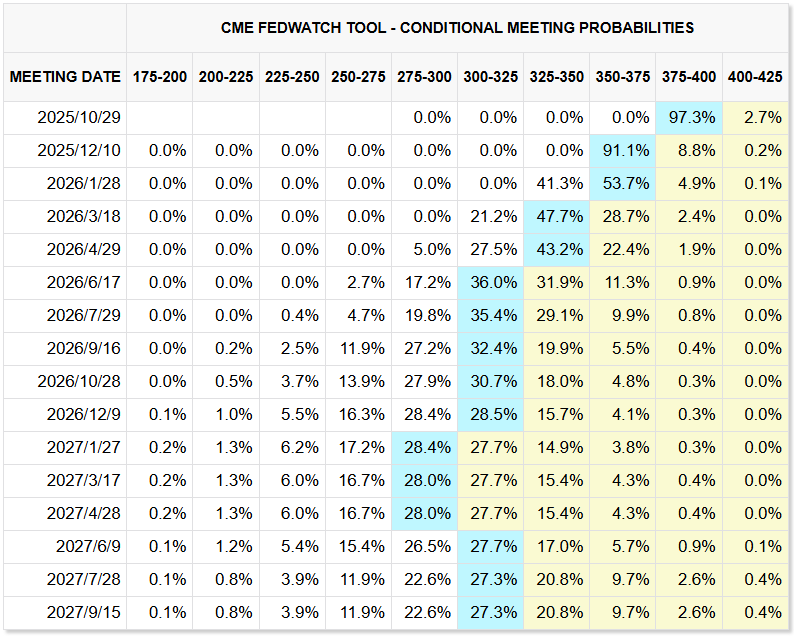 市場對聯準會在 10 月與 12 月各降息 1 碼的定價已大幅傾向「定案」。期貨顯示,10 月 FOMC(10/28–10/29)降息機率已接近 100%,12 月再降 1 碼的機率達九成。