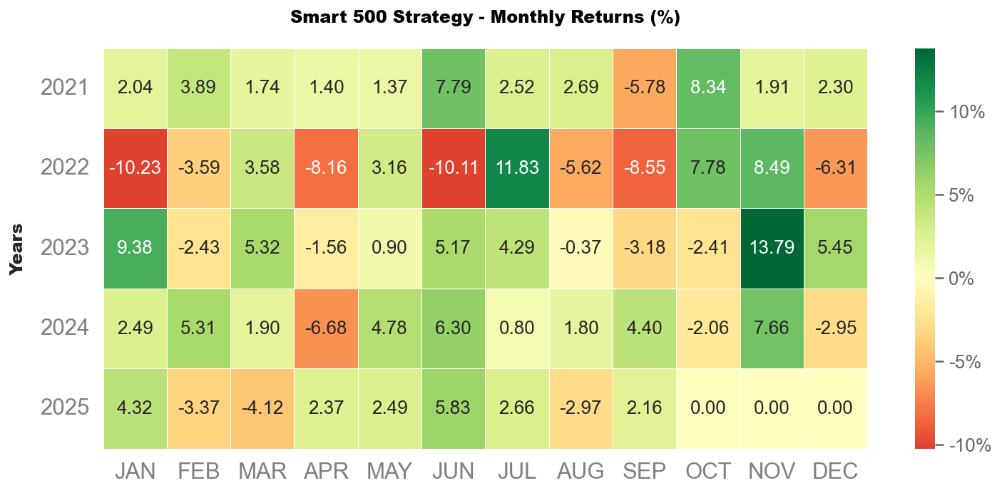 9 月沃勝 Smart 500 投資策略報酬 +2.16%,低於 SPY 的 +4.3%。當月成分股以 SMCI 貢獻最多,上漲 17.6%,其次是 PLTR,上漲 16.1%。