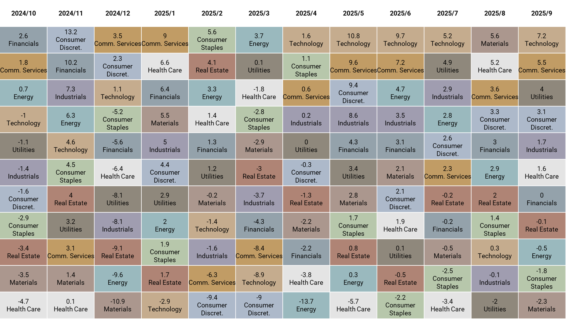 9 月資產表現以黃金與台灣股市表現最佳,分別上漲 11.8% 與 6.6%;標普板塊以科技與通訊服務表現最佳,分別上漲 7.2% 與 5.5%。