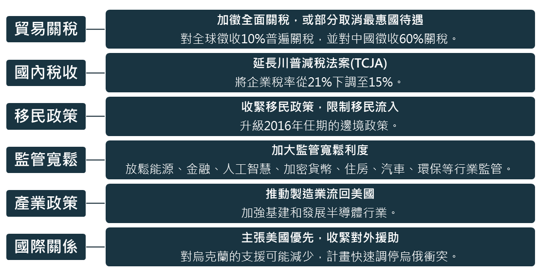 川普政策包括提升關稅、減稅、減少移民和放鬆監管等美國優先政策,對外關稅 + 對內減稅將促進產業資本回流,非美國家美元流出壓力增大,而強美元 + 高利率亦將進一步強化資金流向美國的趨勢。