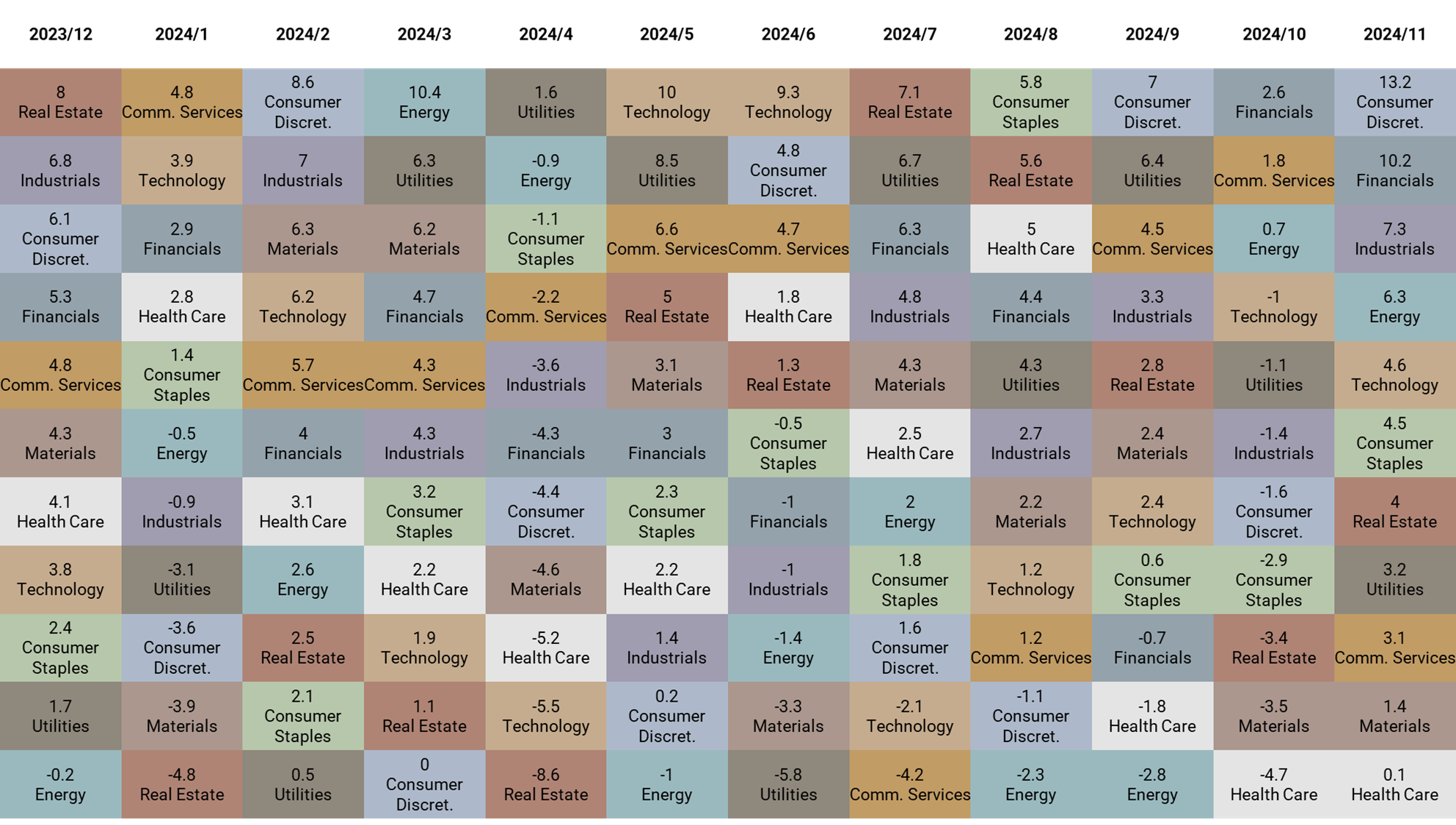 11 月資產表現以美國與已發展國家股市表現最佳,分別上漲 5.7% 與 4.5%;標普板塊以非必須消費品與金融板塊表現最佳,分別上漲 13.2% 與 10.2%。