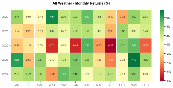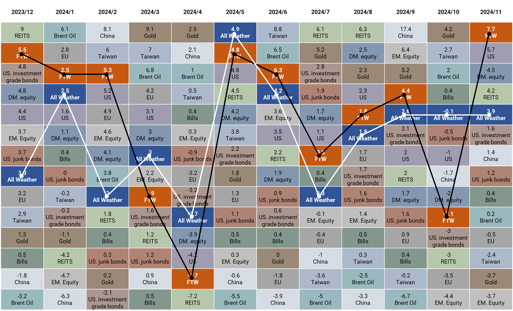 11 月沃勝全天候投資組合上漲 3.93%,年至今共上漲 24.3%。本月以標普500 (SPY) 表現最為亮眼,該資產上漲 6.0%。