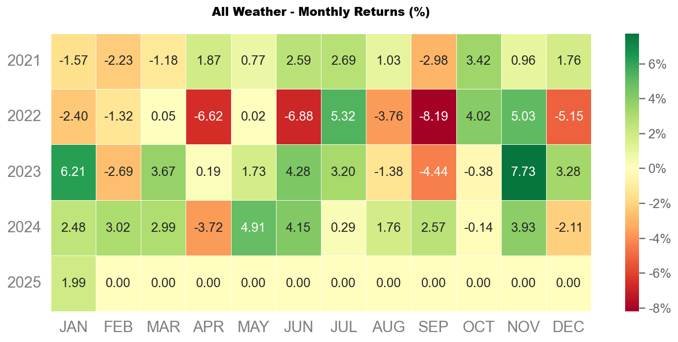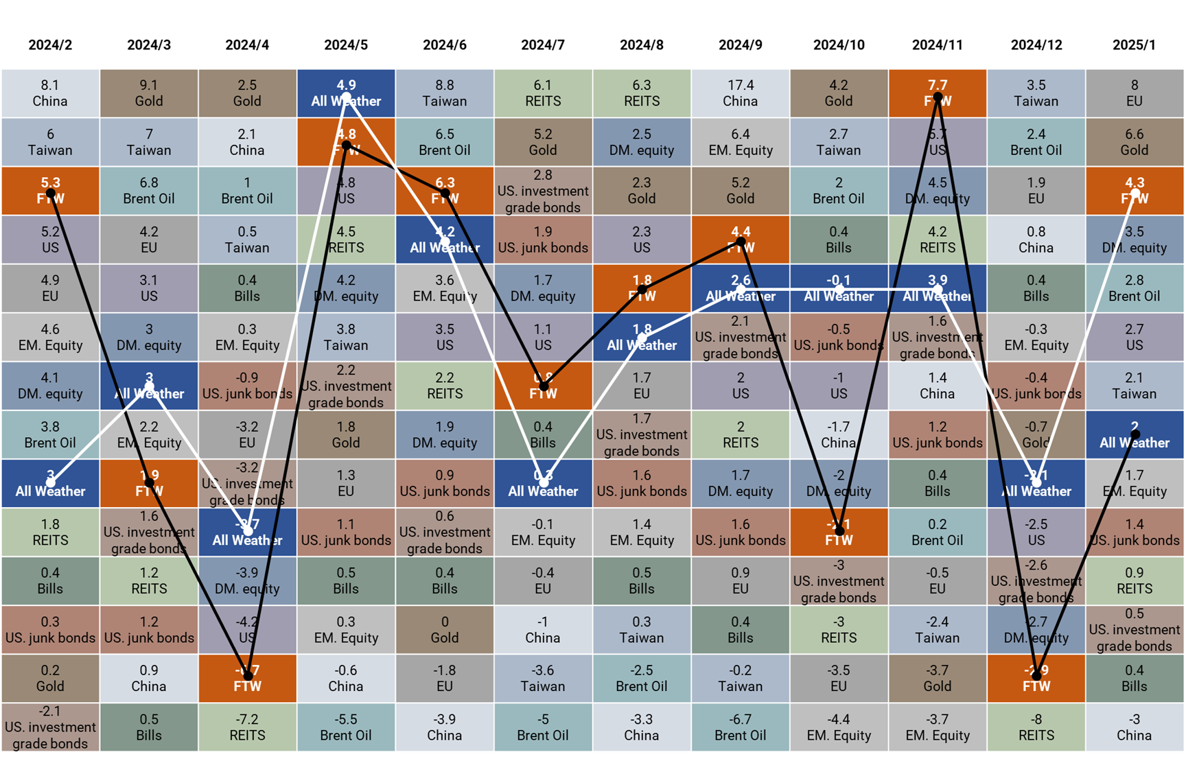 1 月沃勝全天候投資組合上漲 1.99%。當月以黃金(GLD) 表現最佳,該資產上漲 6.8%。