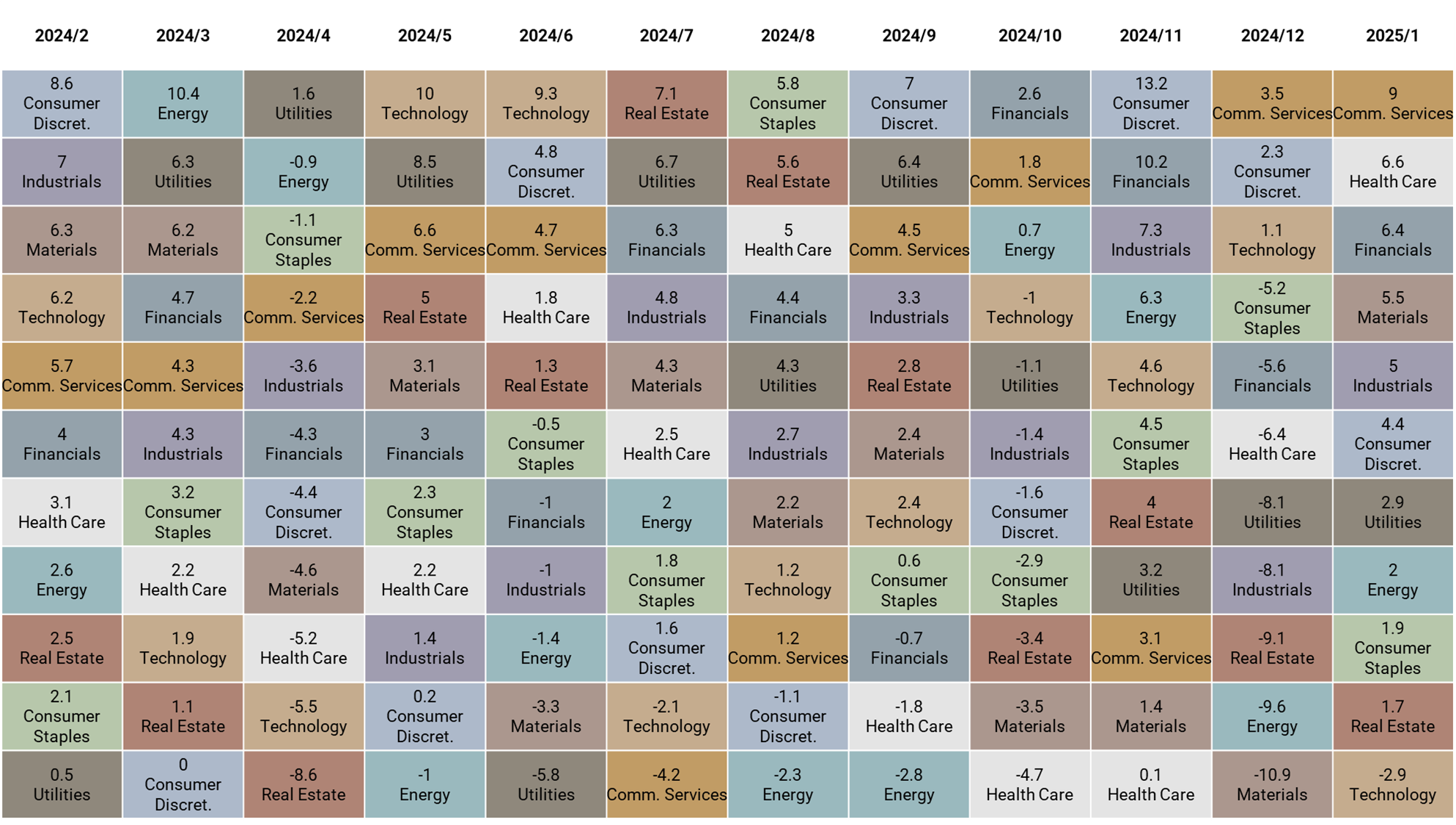 1 月資產表現以歐股與黃金表現最佳,分別上漲 8.0% 與 6.6%;標普板塊以通訊服務與醫療保健表現最佳,分別上漲 9.0% 與 6.6%。