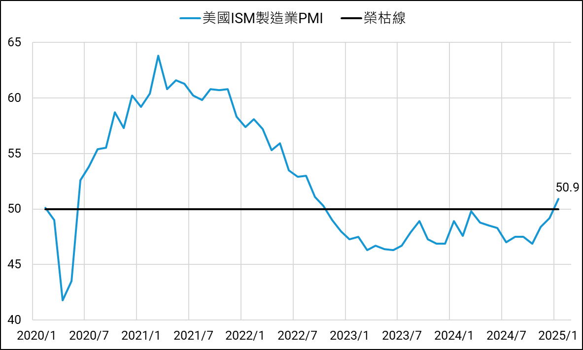 美國製造業在 2025 年 1 月結束了長達 26 個月的萎縮期,ISM 製造業 PMI 指數升至 50.9%,較 2024 年 12 月的 49.2% 上升 1.7 個百分點,重回擴張區間。此數據顯示美國製造業需求回溫,生產與就業同步改善,但庫存下降,顯示企業仍保持謹慎態度。