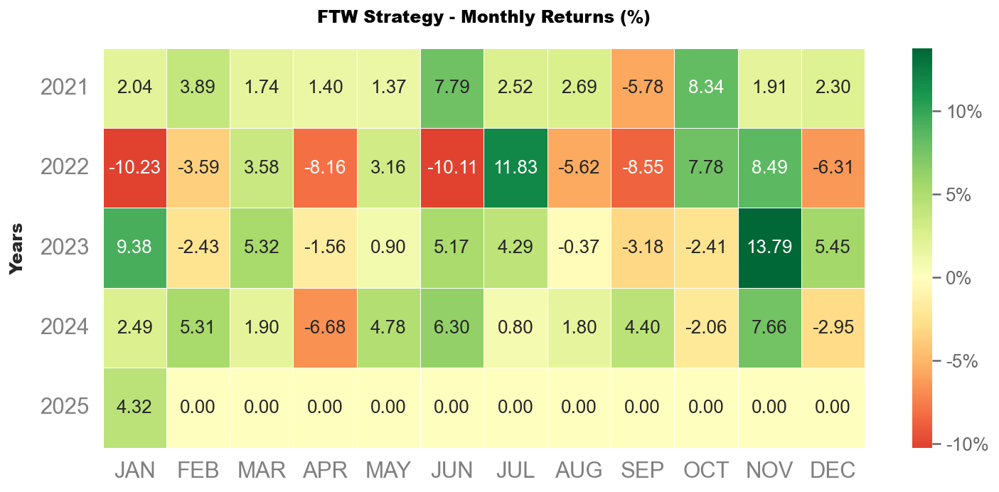 1 月沃勝 FTW 投資策略上漲 4.3%,超越 SPY 的 2.7%。當月成分股以 FFIV 貢獻最多,上漲 18.2%,其次是 META,上漲 17.7%。