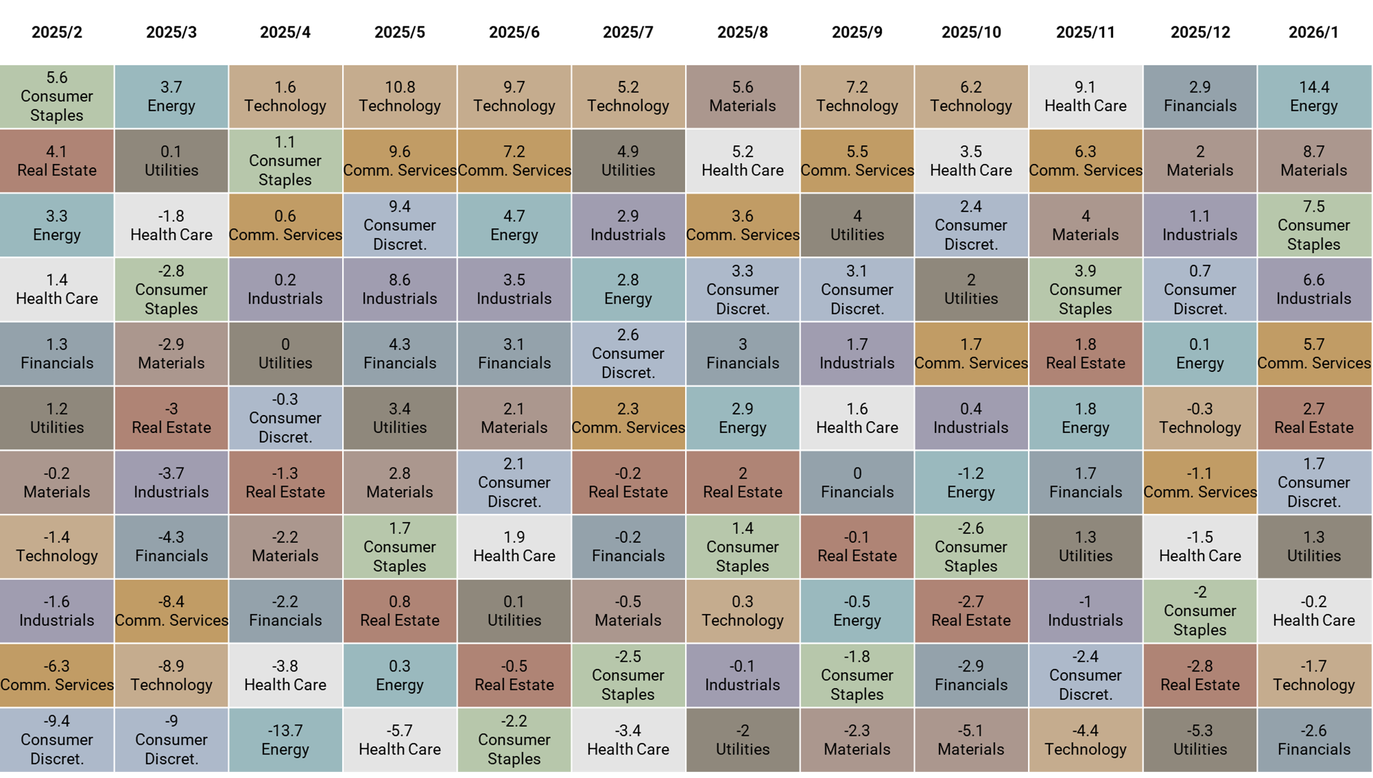 1 月資產表現以原油與黃金表現最佳,分別上漲 15% 與 12.3%;標普板塊以能源與原物料表現最佳,分別上漲 14.4% 與 8.7%。
