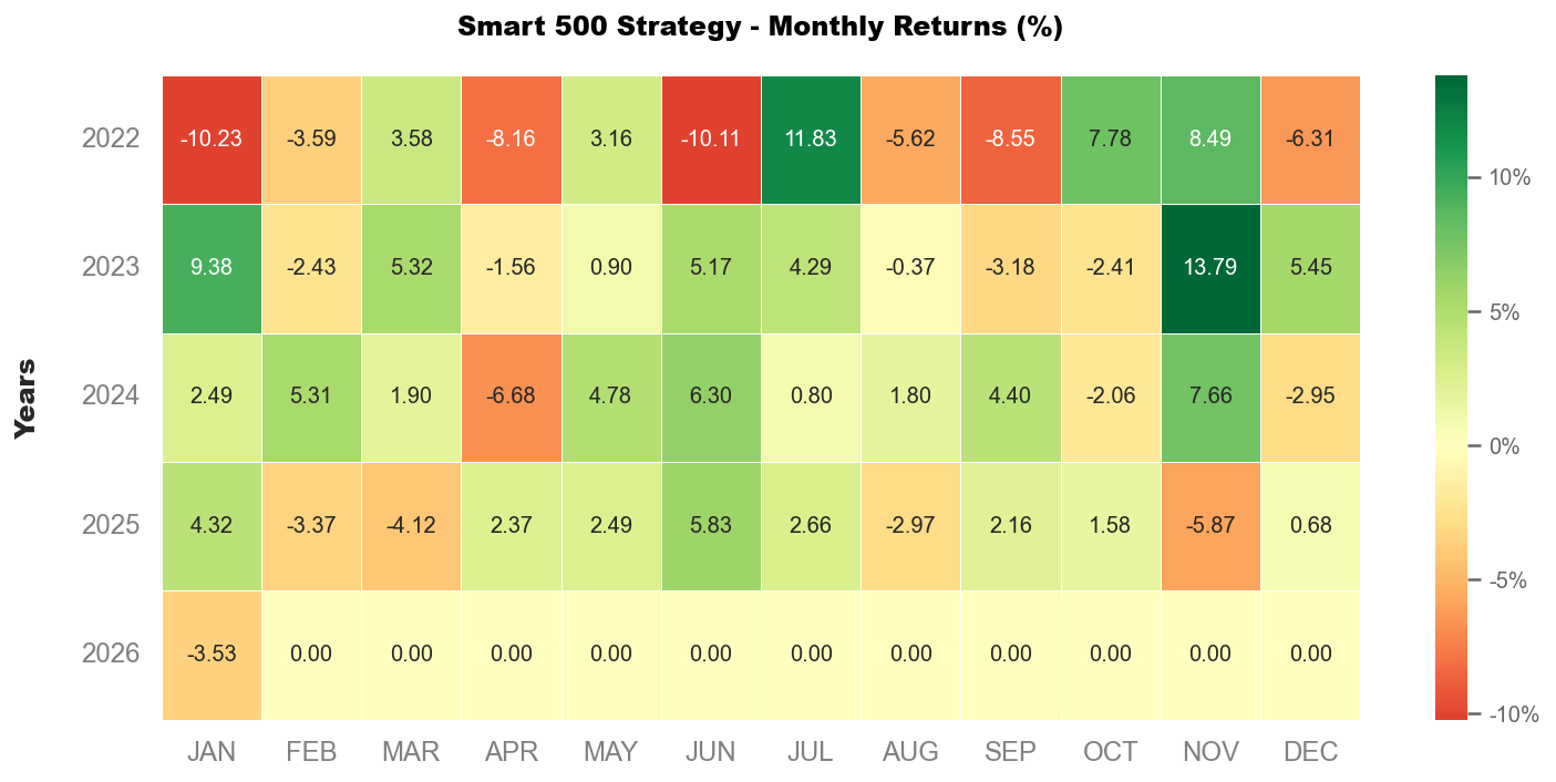 1 月沃勝 Smart 500 投資策略報酬 -3.53%。當月成分股以 DXCM 貢獻最多,上漲 10.0%,其次是 TECH,上漲 9.0%。