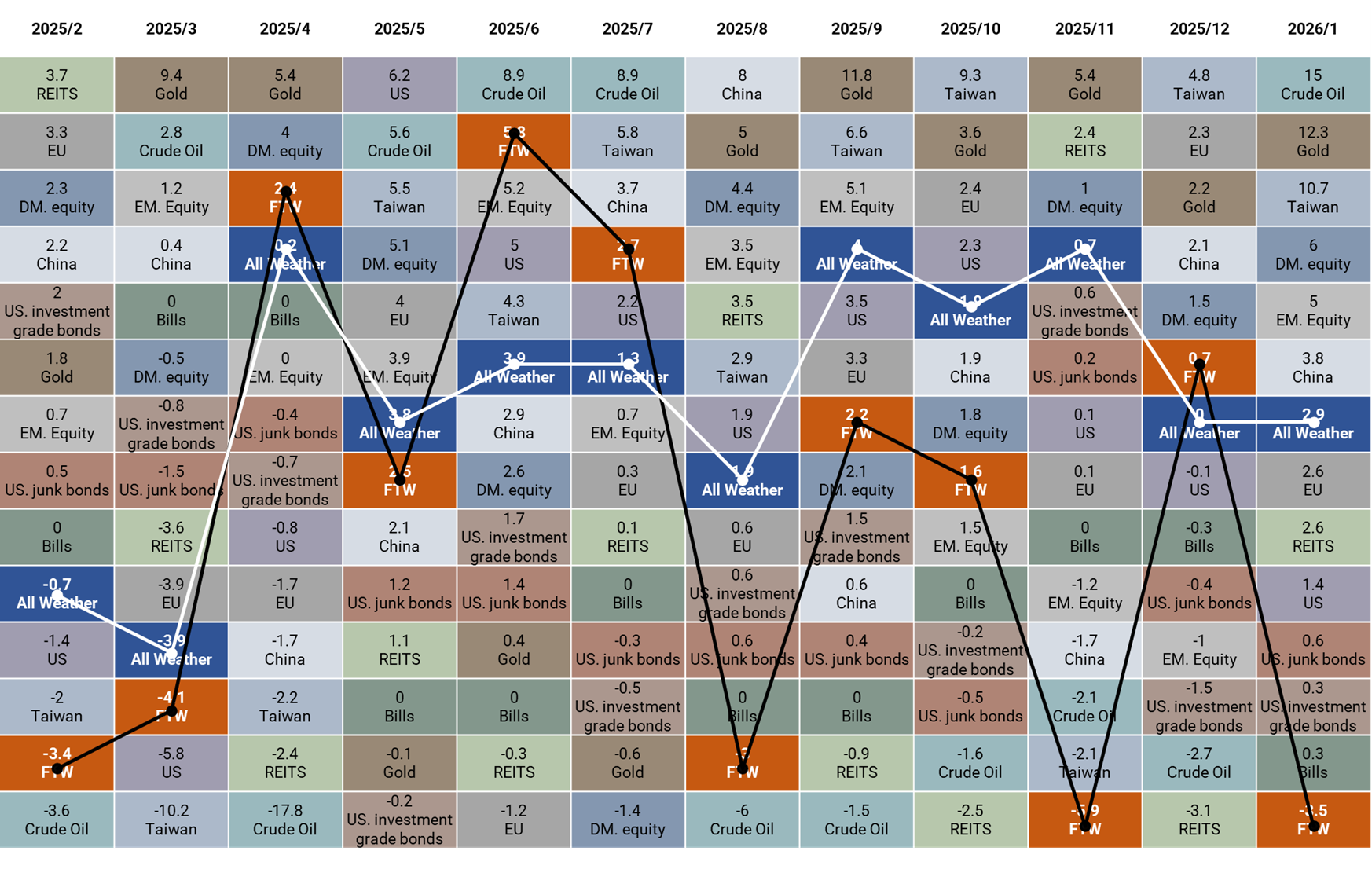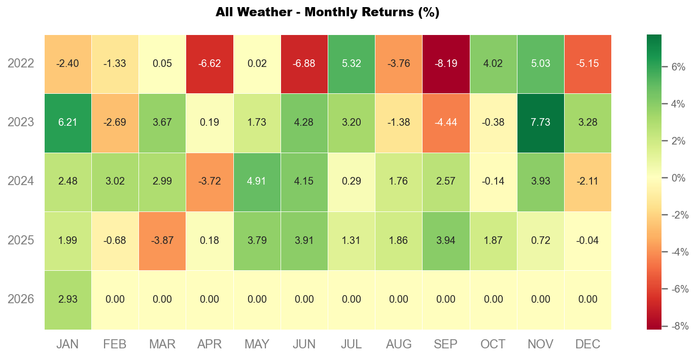 1 月沃勝全天候投資組合報酬 +2.93%。當月以黃金 (GLD) 表現最佳,該資產上漲 12.3%。
