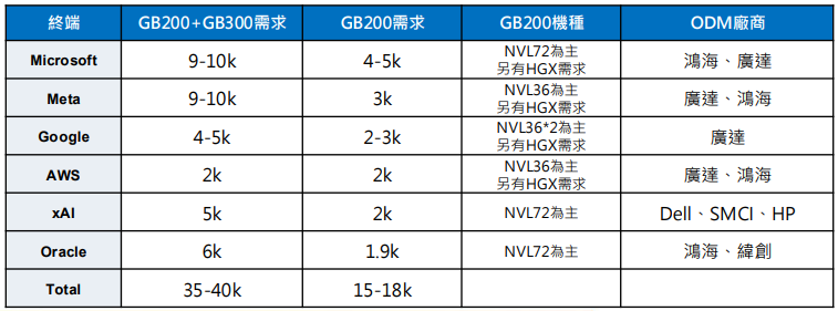 GB300 散熱規格符合市場預期:B300 系列預期計於 4Q25 量產,搭載 NVLink 72 較 B200 系列算力提升 1.5 倍,機架功耗也將從 132kW 增加至 144kW,其 Computing Tray 散熱模組化取消改由 CPU 及 GPU 上各自覆蓋 Cold plate,進而使QD 用量從 6 顆提升至 24顆,QD 產值大幅提升成為 GB300 此次散熱升級的亮點 ,整體散熱產業成長逾 50% 。GB300 系列首批客戶包含 AWS、Google、Microsoft 和 Oracle 等,後續 Dell、HP、 Lenovo 和 Supermicro 等 OEM 也將推出 Blackwell Ultra ( B300 ) 伺服器。