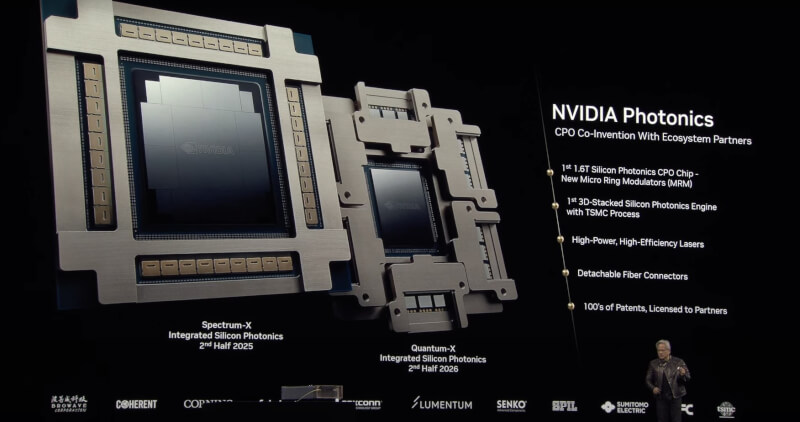 網通部分,Quantum X 交換機預計於 2H25 推出,其 CPO 系統是目前首個 1.6 Tbps CPO,相較於傳統的插拔式光收發模組,CPO 具有更高的密度和更低的功耗 CPO 通過將光子晶片與電子晶片堆疊,直接將光纖連接到交換器,可以為大型資料中心節省數十兆瓦的電力。Spectrum X 矽光子交換機則預計 2H26 推出,提供更高密度、更低功耗 的光學互連技術,優化 AI 運算與超級電腦架構。