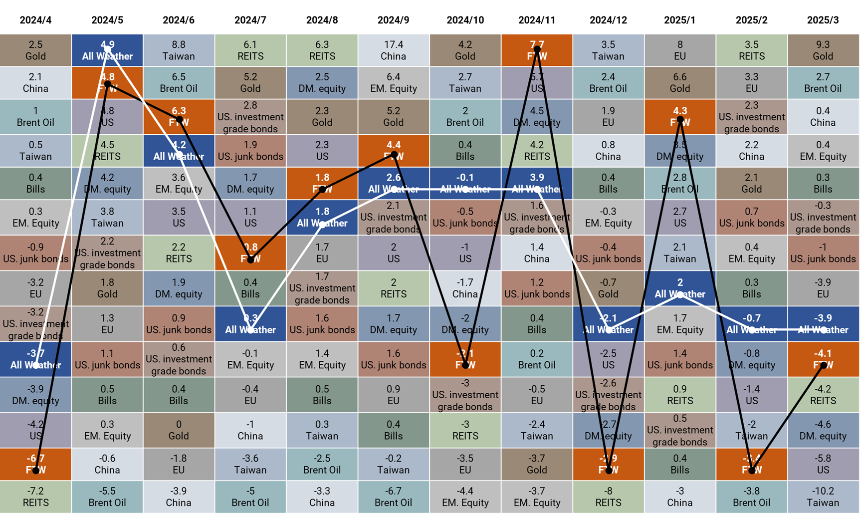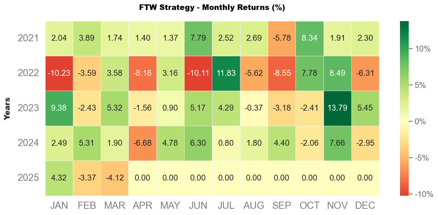 3 月沃勝 FTW 投資策略報酬 -4.12%,優於 SPY 的 -5.57%。當月成分股以 MKTX 貢獻最多,上漲 12.2%,其次是 EA,上漲 11.9%。