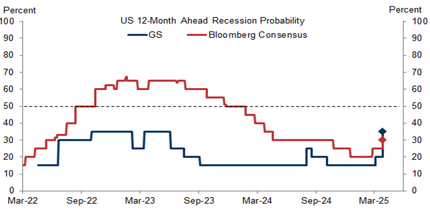 隨全球貿易戰升溫,關稅轉嫁物價帶來通膨影響將限縮聯準會貨幣政策施展,當前美國消費者及企業信心持續減弱,一旦勞動力市場出現嚴重下滑,將使衰退風險大幅提升,使現有溫和停滯性通膨轉為衰退,高盛預期美國近一年衰退機率由 20% 升至 35%,彭博一致預期也將美國衰退機率由 25% 上修至 30%。