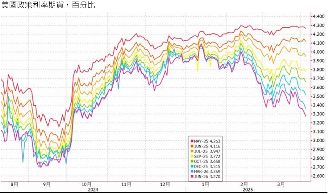 聯準會主席 4 日指出,川普政府遠高於預期的關稅政策將為經濟帶來長遠影響,現在判斷貨幣政策的適當路徑還言之過早,因此聯準會不急於降息。然而當前聯準會的長期中性利率為 3.0%,一旦經濟衰退將迫使聯準會將政策利率快速降息至 3.0%之下。 當前市場定價 2H25 降息五次,六月首次降息將一次降息 2 碼,全年合計降息 1.25%。