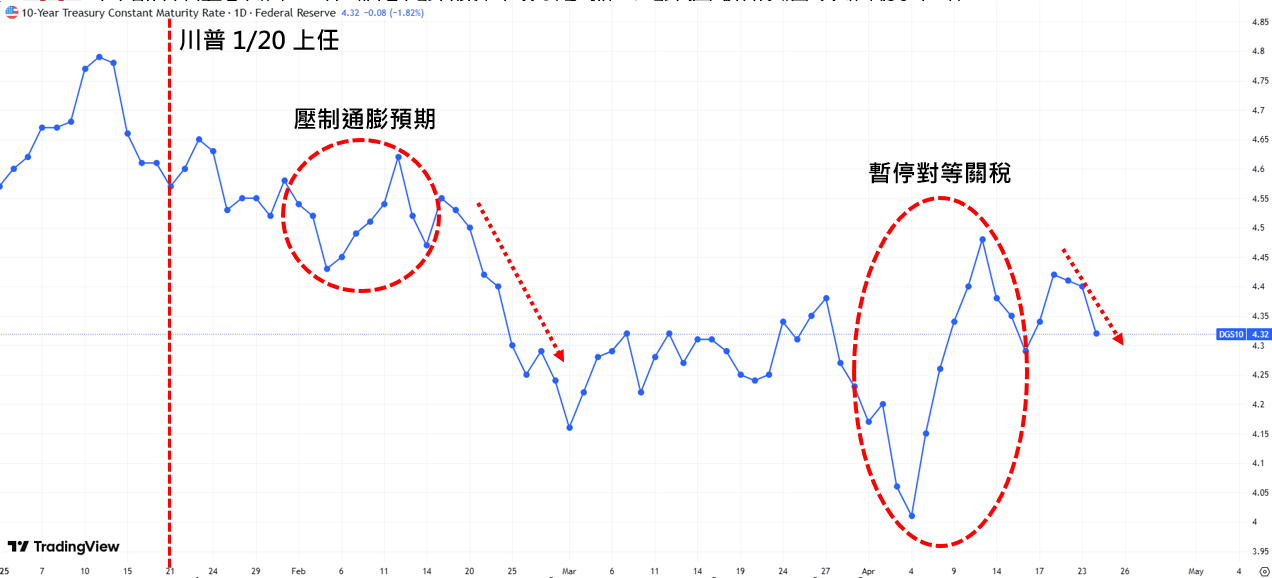 相比於股市而言,多次回顧皆顯示川普和財政部更加關注 10 年其美債殖利率價格,每當美債殖利率升破到一定數據,財政部時常會聯合 FED 放鴿壓抑殖利率的上升動能,今年 2 月、4 月皆是如此。