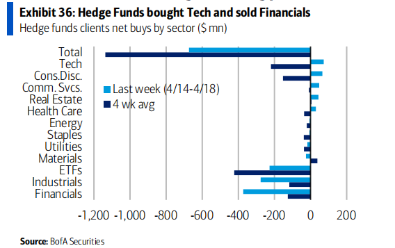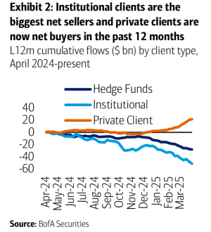 同樣的事情亦發生在美股,雖然在美股 4/9 暫停對等關稅至今漲幅逾 10%,然而目前大多數的買家為散戶居多,甚至創下 2008 有數據以來年初至今最長的買入紀錄,機構仍延續過去賣出的趨勢,顯示出對美國資產缺乏信心,除過去科技股超跌,因此機構在上周呈淨買入以外,金融股、工業、ETFs 等多數都持續淨賣出。