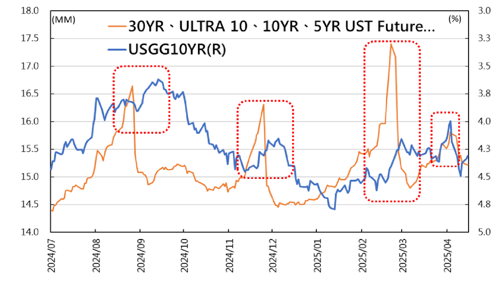 而近期公債期貨的未平倉量來看,近期未平倉量並沒有像過去的高點到很多,顯示即使未來再次出現如對等關稅等引起恐慌性拋售的事件,由於籌碼量本身現已不高,整體而言,應難以再次重演如 4/2~ 4/11 號之間的大規模公債拋售潮致使的殖利率飆升情形。