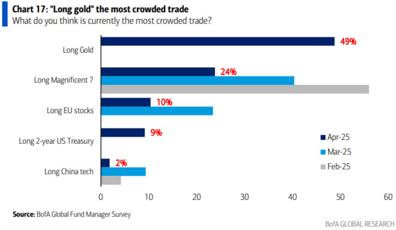 25 年初黃金累計漲幅已近三成,近期更突破每盎司 3,500 美元,儼然成為繼「Magnificent 7」後最壅擠的交易。 儘管目前金價自高點回落至約 3,245 美元,但由於實體需求熱度仍在、各國央行未停止購金,黃金價格中長線仍具支撐。但短線需提防過度擁擠交易下的波動與修正風險。