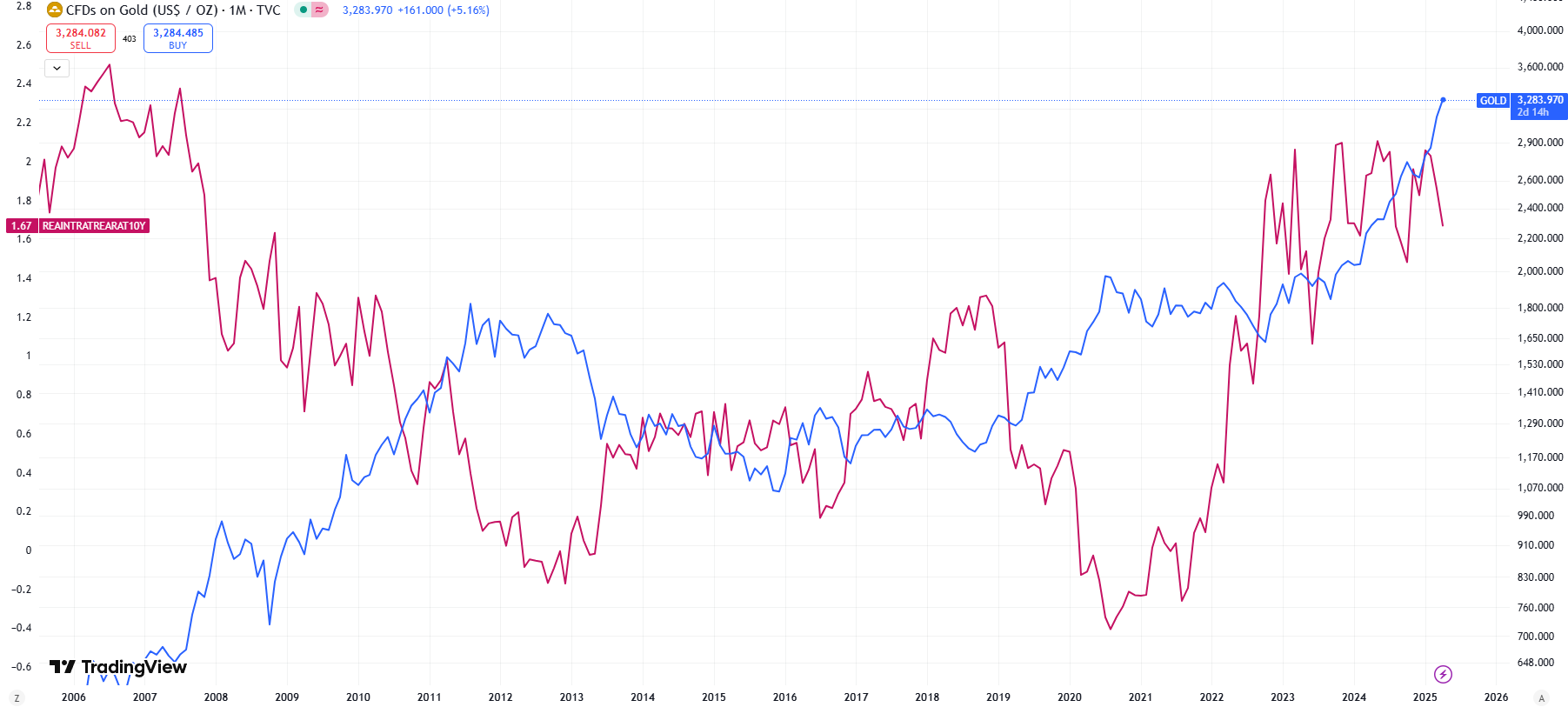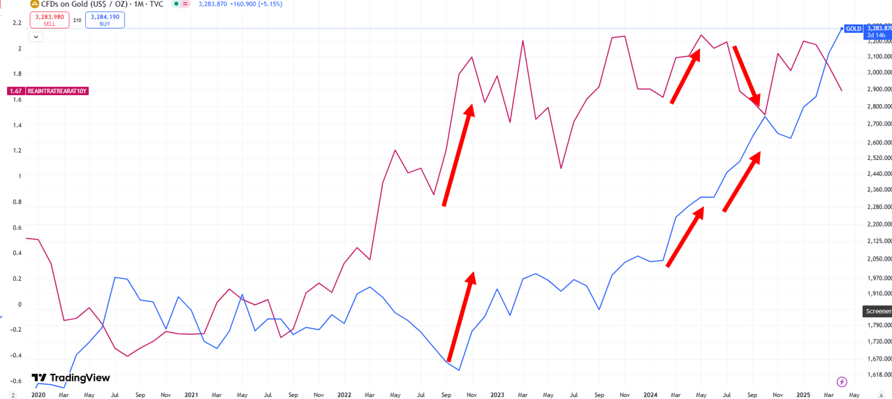 ( 然而兩者關係脫鉤並不是指實質利率不再是影響黃金價格的因素,實際上,降息時實質利率下降是有利於黃金資產價格的,只是目前而言背後有更強勁的理由在推動黃金價格 )