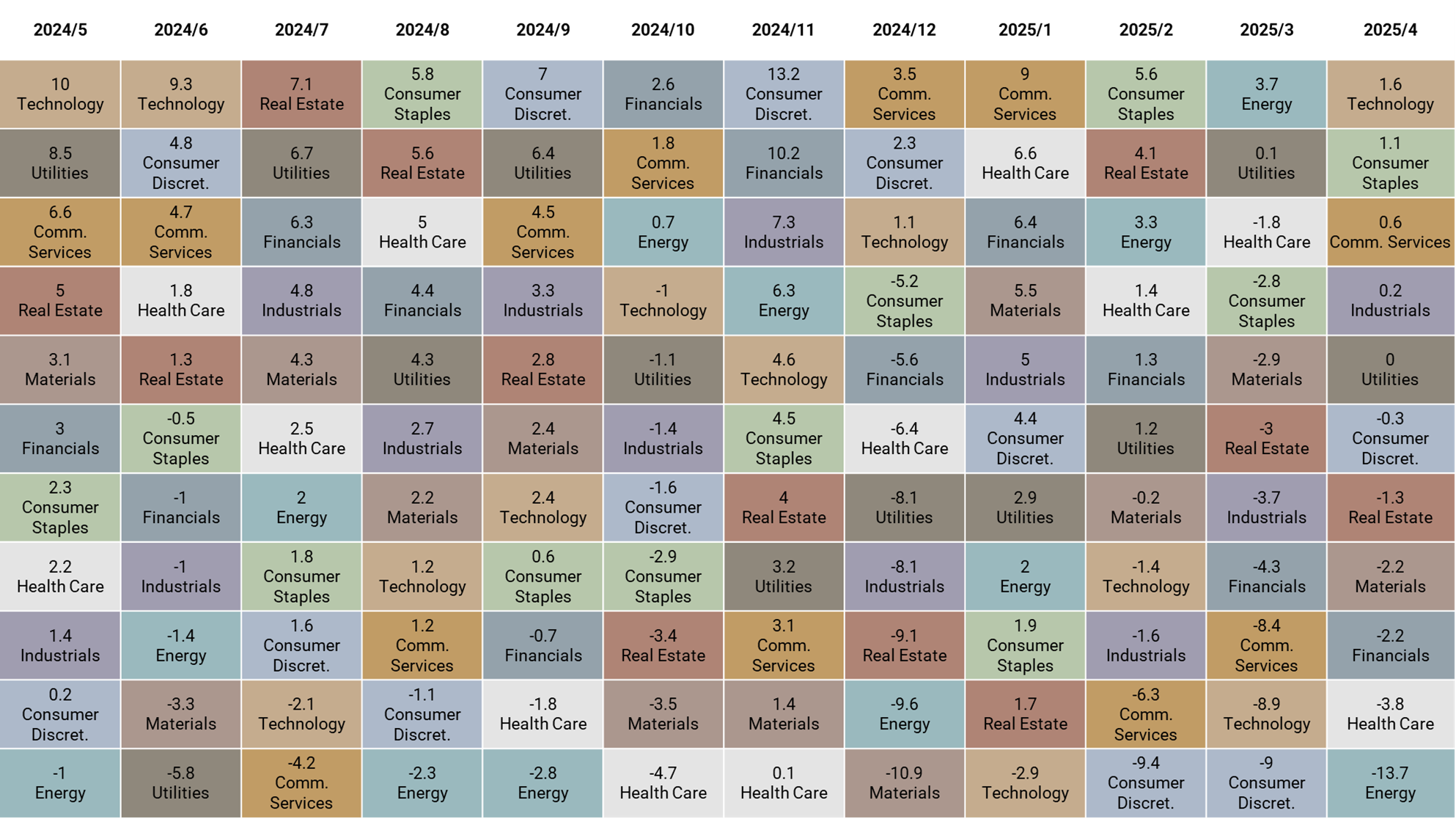 4 月資產表現以黃金與新興市場表現最佳,分別上漲 5.3% 與 1.0%;標普板塊以科技與必需消費表現最佳,分別上漲 1.6% 與 1.1%。