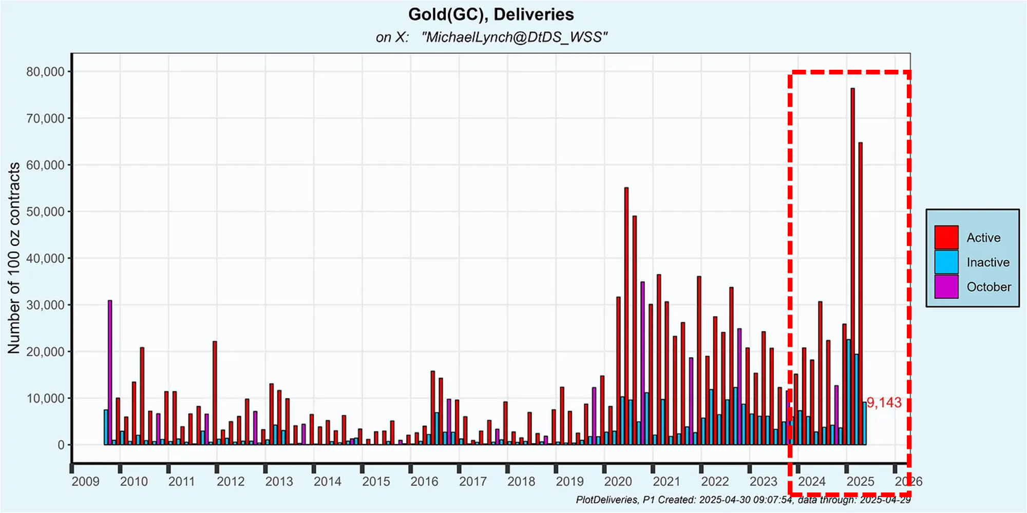 在過去全球的黃金交易中,僅有 1% 的黃金屬於實體交易,剩下的 99% 幾乎為紙黃金 (期貨、ETF) 間的交易,然而從去年 11 月開始, 美國芝加哥商品期貨交易所 (COMEX) 的黃金庫存在川普選舉上任後迅速飆高,庫存量從 11 月的 1,734 萬迅速竄升至 4 月高點 4,487 萬,顯示美國正從英國 (LMBA)、瑞士等地大量進口實物黃金,其中可明顯看到,黃金期貨的實物交割量在今年以來開始以歷史性的速度快速攀升,在 2、4 月的交割合約數高達 76,748 和 65,602 份,遠高於 2020 年以來主力交易月份的合約數平均 32,848 份。
