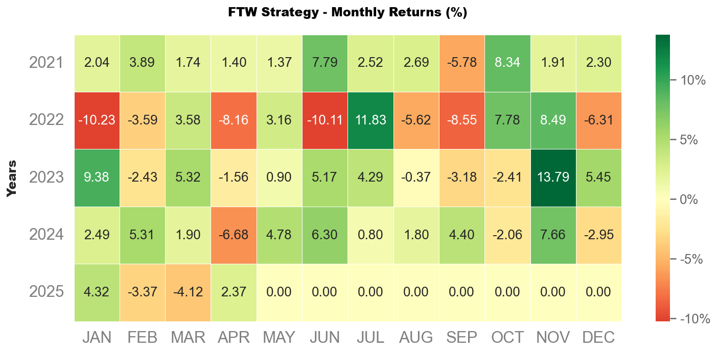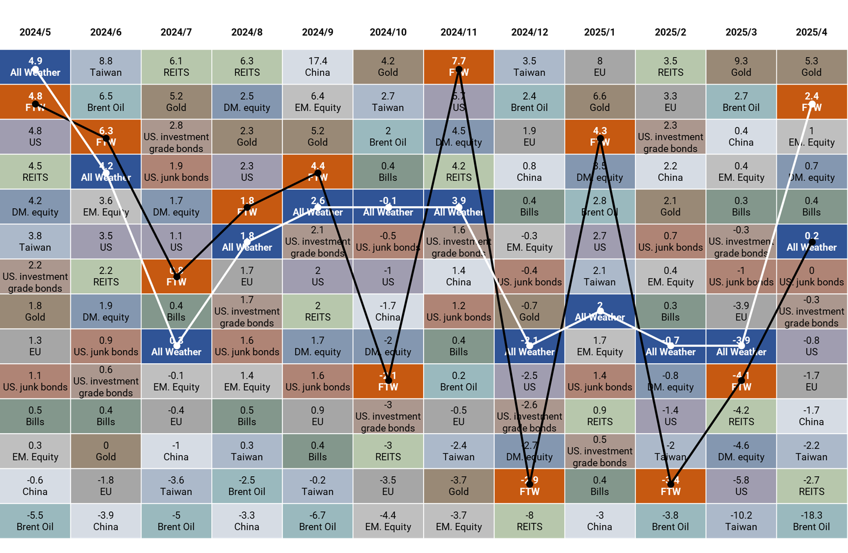 4 月沃勝 FTW 投資策略報酬 +2.37%,優於 SPY 的 -0.87%。當月成分股以 CDNS 貢獻最多,上漲 17%,其次是 ROST,上漲 9%。