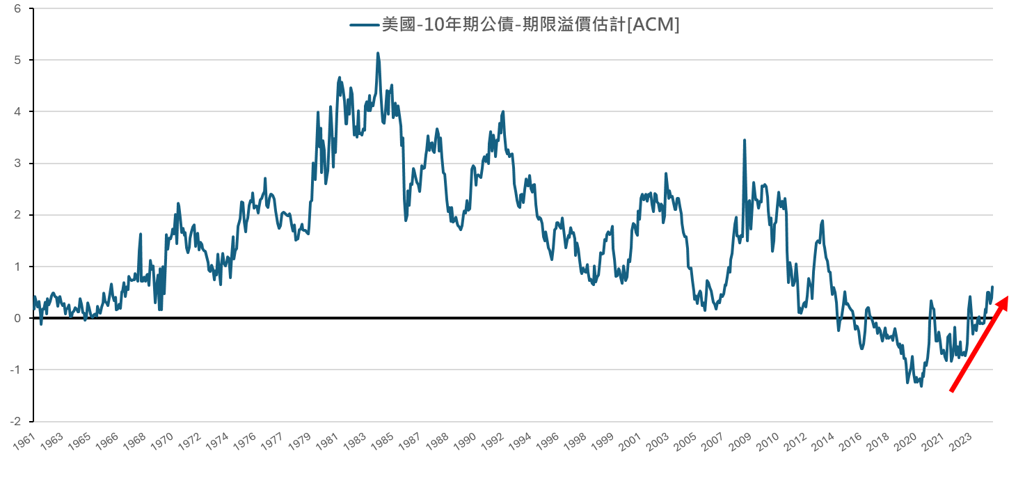 據紐約聯儲經濟學家 Tobias Adrian 、 Richard Crump 和 Emanuel Moench 模型,自 2024 年以後,期限溢價便持續性的走高,至今已突破 2014 年以來的高點,成為即使實體經濟趨弱,仍無法有效降低美國公債殖利率的主因之一,我們將近期推升期限溢價的因素,主要歸咎於政策面的矛盾性。