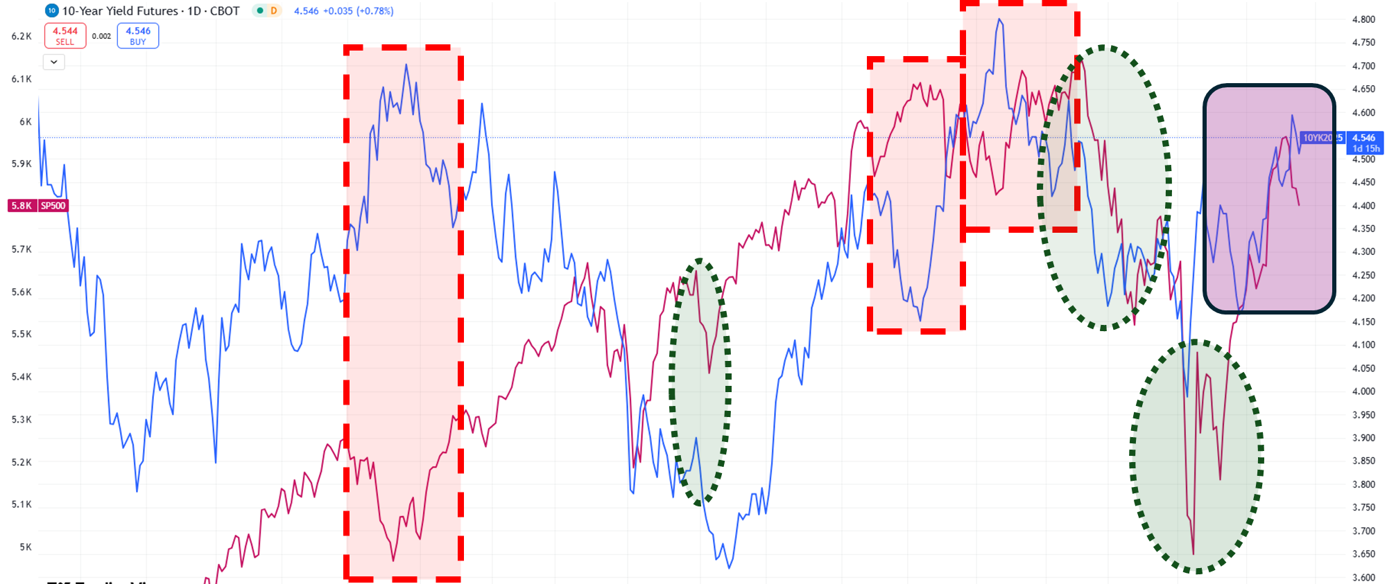 一般而言,公債殖利率的飆升是會壓抑倒公司的估值評價,進而壓抑到整體評價,因此可以看到在紅框區段,在一般時期公債殖利率上升時,S&P 500 下跌,而殖利率下降時,有利 S&P 500 上漲,兩者呈負相關。