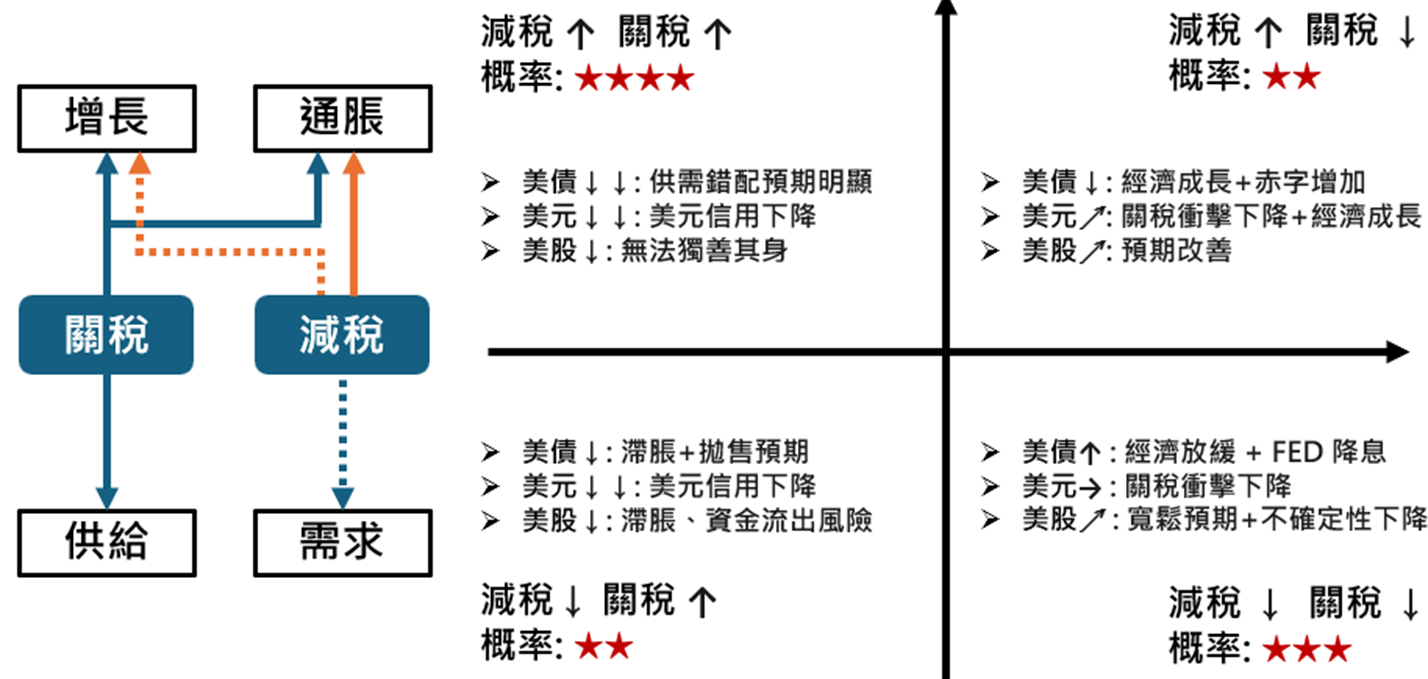 而總體而言,對於不同的情境,股債匯市也將有不同的結果發生: