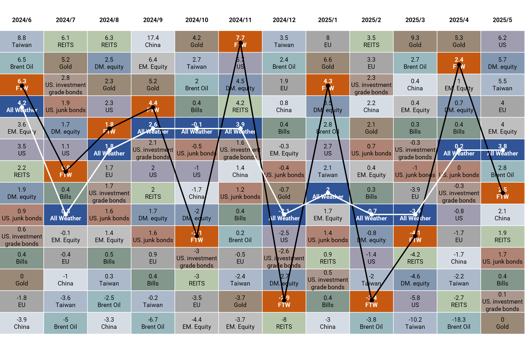 5 月沃勝 FTW 投資策略報酬 +2.49%,低於 SPY 的 +6.28%。當月成分股以 LRCX 貢獻最多,上漲 13%,其次是 MPWR,上漲 11.6%。