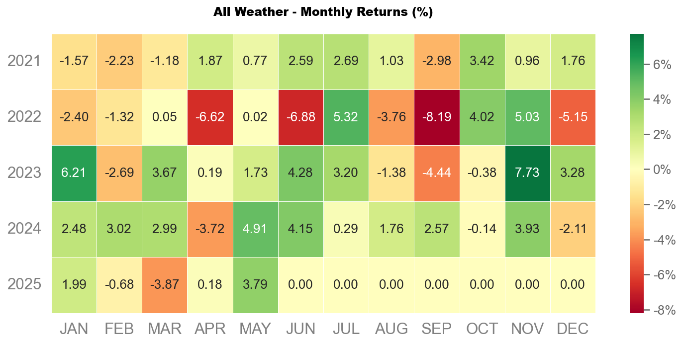 5 月沃勝全天候投資組合報酬 +3.79%。當月以科技股 (XLK) 表現最佳,該資產上漲 10%。