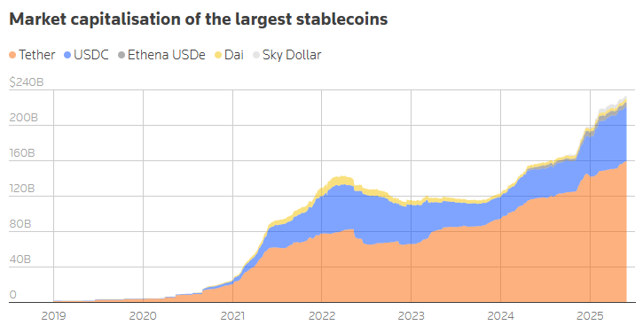 - 美元霸權延伸——99% 穩定幣與美元掛鉤,結算量已與 Visa 媲美,美債需求同步擴張;