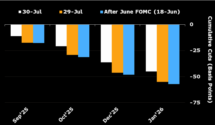 理事 Waller 在 7 月 17 日公開表態,呼籲當月即應降息 25 bps,並認為近期關稅導致的通膨壓力屬暫時性。此番言論帶動市場重新定價,預期聯準會將於 9、10、12 月各降息一碼。不過,路透調查及投資人定價仍保留態度,指出若通膨黏性高於預期,9 月前啟動降息的機率仍偏低。