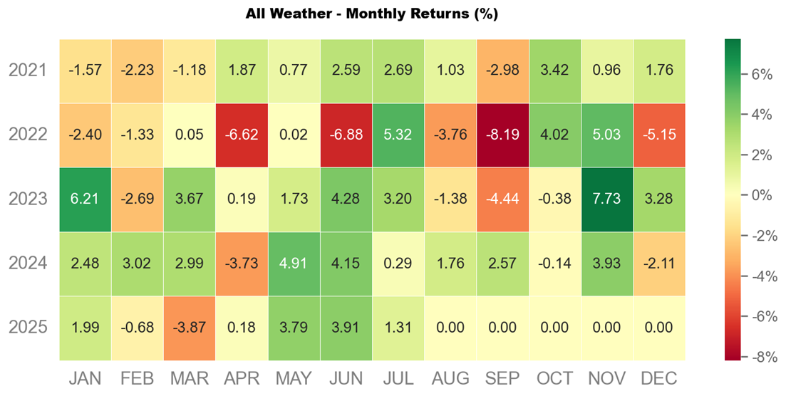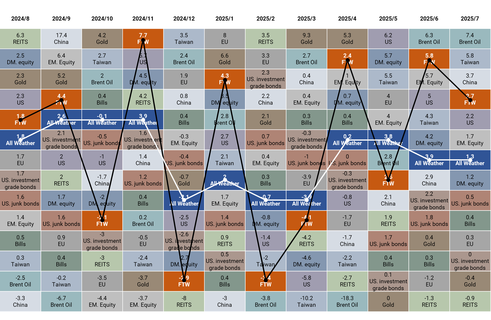7 月沃勝全天候投資組合報酬 +1.31%。當月以科技股 (XLK) 表現最佳,該資產上漲 3.8%。