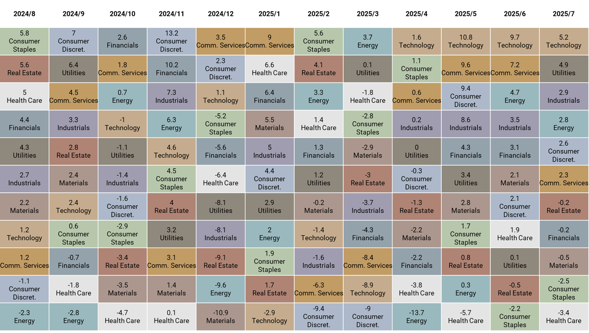 7 月資產表現以原油與台灣市場表現最佳,分別上漲 7.4% 與 5.8%;標普板塊以科技與公共事業表現最佳,分別上漲 5.2% 與 4.9%。