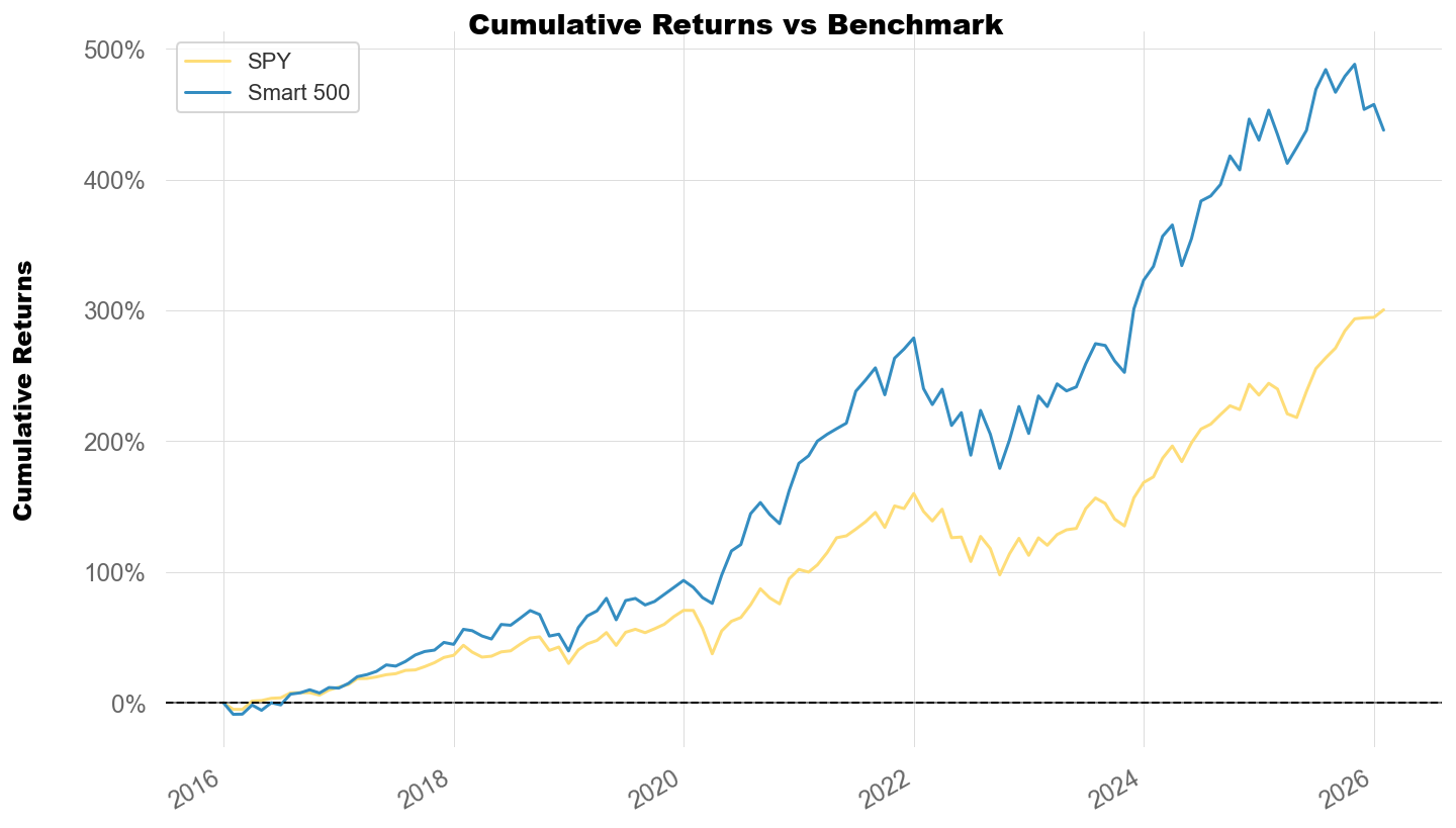 接著模型會將S&P 500成分股依照加權結果分組,Smart 500 選出分數前10%的股票組合,並且每個月底進行動態調整。