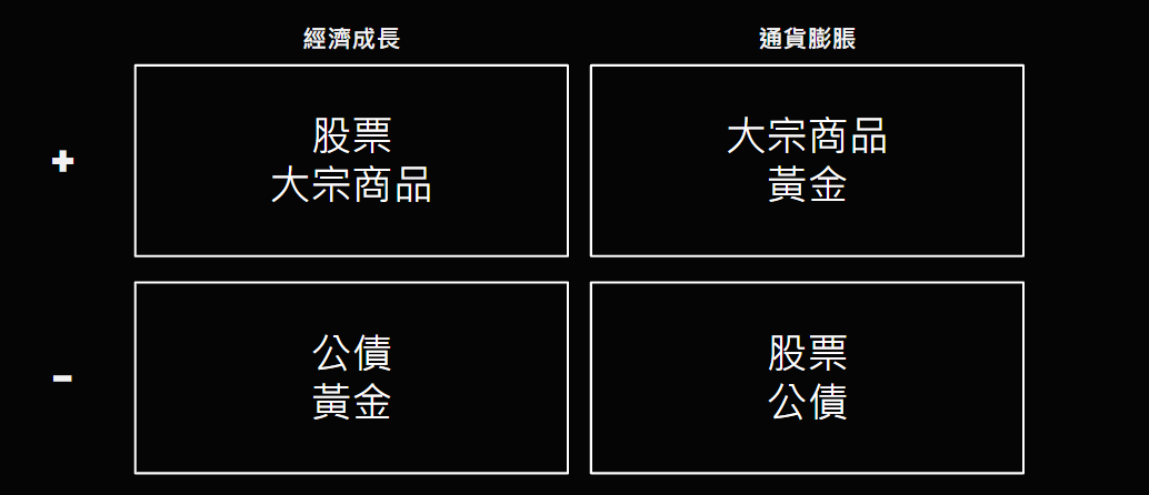 Dalio 將這四種經濟情境整理成一個矩陣,如下所示: