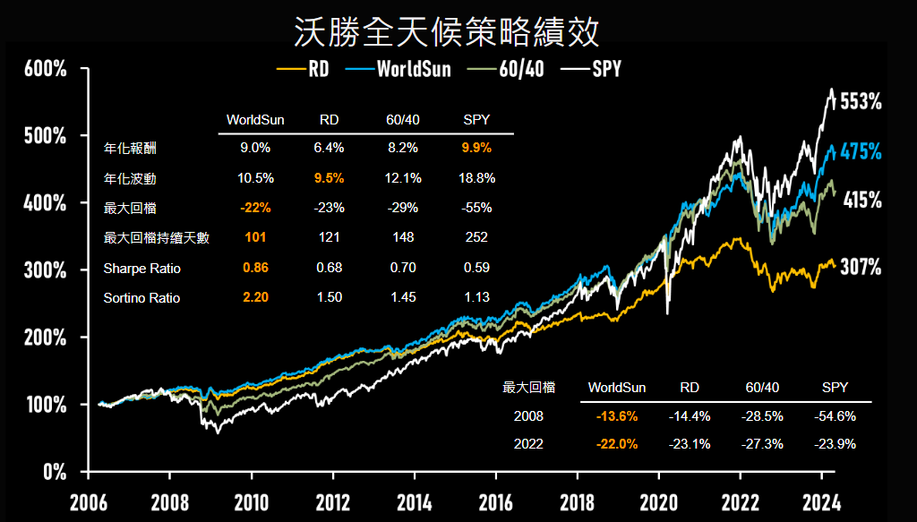 從2006年至2024年4月的回測結果顯示,沃勝全天候組合的年化報酬率為 9%,雖然略低於標普 500 的 10%,但顯著高於 Ray Dalio 的 6.4% 和傳統 60/40 投資組合的 8.2%。在波動方面,沃勝全天候組合的年化波動率為 10.5%,遠低於標普 500 的 18.8%,而且最大回撤僅為 22%,明顯低於標普 500 的 55%。