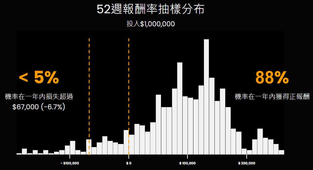 回測期間的 52 週報酬率抽樣分布顯示,在任意時點投入 $1,000,000,有 88% 的機率在一年內獲得正報酬,且損失超過 $67,000(-6.7%)的機率僅不到 5%。這樣的損失可能性與大多數投資者的風險耐受度相符。