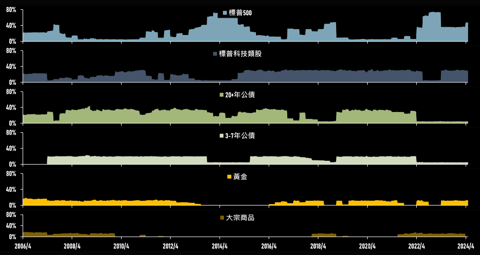 我們的模型在2008年和2020年市場崩盤期間,主動降低了股票部位的配置,並提高了避險資產的占比,有效展現了沃勝全天候組合的風險對沖效果。