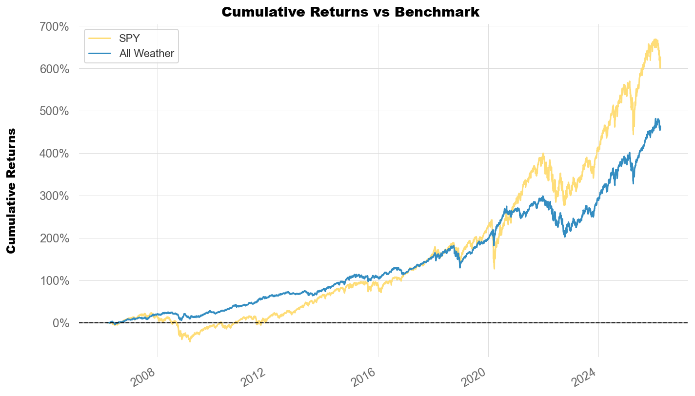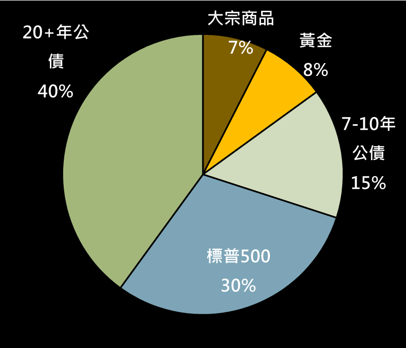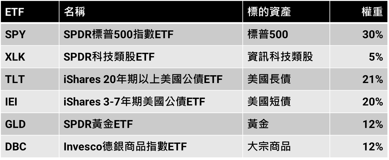 全天候投資組合是一種資產配置的概念,其目標是在各種經濟環境中均能表現出色。Ray Dalio 因此建構了一個包含55%美國債券、30%美國股票和15%實體資產(黃金和大宗商品)的投資組合。