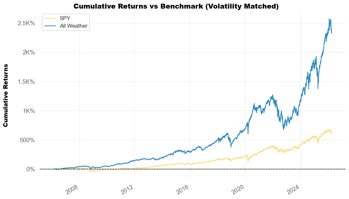 這個基金的設立目的與 Dalio 最初的假設相吻合,即創建一個不會因意外事件而大幅波動的投資組合。正如橋水基金在《The All Weather Story》中所述: